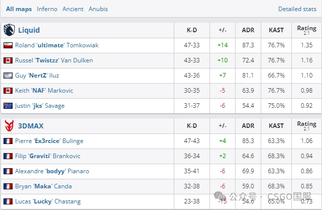 图一Inferno总监大杀四方,ultimate也手感火热,液体早早10-5领先。虽然法国队打出一波6-1一度追至11平。然而最重要的关键局由液体拿下,并2分之差先下一城。图二法国队的防线如铜墙铁壁,半场豪取9分。换边液体也未能发起反击,3DMAX扳回一城。来到决胜图ultimate火力全开,液体进攻拿下8分,换边后3DMAX更是一分没拿便光速落败。